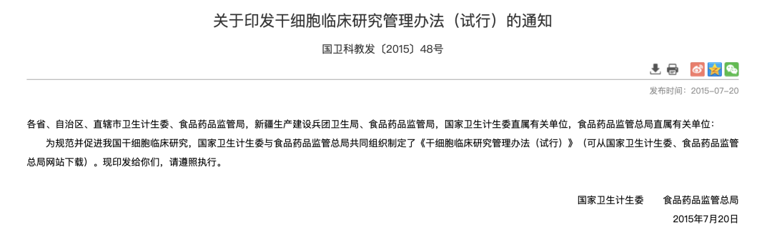 但寬松的政策環境,除了促進了干細胞行業的發展,但是另一方面也使干細胞行業變得魚龍混雜,良莠不齊。為了從源頭上規范醫療技術使用、遏制濫用,2015年初,國務院決定取消“非行政許可審批”這一審批類別,在此背景下,原國家衛生計生委取消了第三類醫療技術臨床應用準入審批。然而,取消審批并不等于放手不管。同年,為規范并促進我國干細胞臨床研究,國家衛生計生委與食品藥品監管總局共同組織制定了《干細胞臨床研究管理辦法(試行)》,這也是目前醫藥行業進行干細胞臨床研究時遵循的總指導原則。