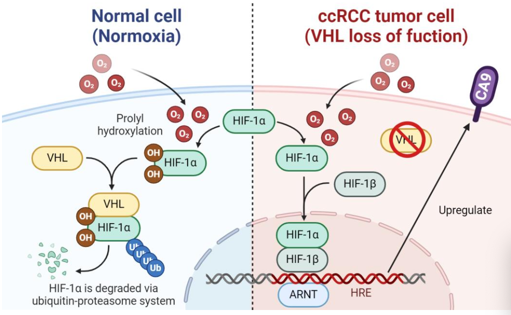 CAIX(碳酸酐酶IX)是一種由459個氨基酸殘基構成的跨膜蛋白,作為腫瘤相關酶在多種惡性腫瘤中特異性高表達。其表達受HIF-1α信號通路調控,尤其在腫瘤低氧微環境中呈現顯著上調特征。該酶通過催化二氧化碳水合作用參與細胞pH穩態調節,其異常活化可促進腫瘤細胞在酸性微環境中的適應性生存與增殖。在透明細胞腎細胞癌(ccRCC)中,約90%的病例因VHL基因缺失導致HIF-1α持續性核內蓄積,繼而引發CAIX的異常高表達。這種分子級聯反應不僅引起細胞外微環境酸化,更通過干擾細胞黏附信號通路促進腫瘤細胞脫離原發灶,顯著增強其侵襲轉移潛能。盡管CAIX已被國際學界公認為腎癌診療的關鍵分子靶點,但截至目前,全球范圍內尚未有靶向該蛋白的臨床治療藥物獲批上市,這一現狀凸顯了該領域藥物研發的迫切需求與重要研究價值。