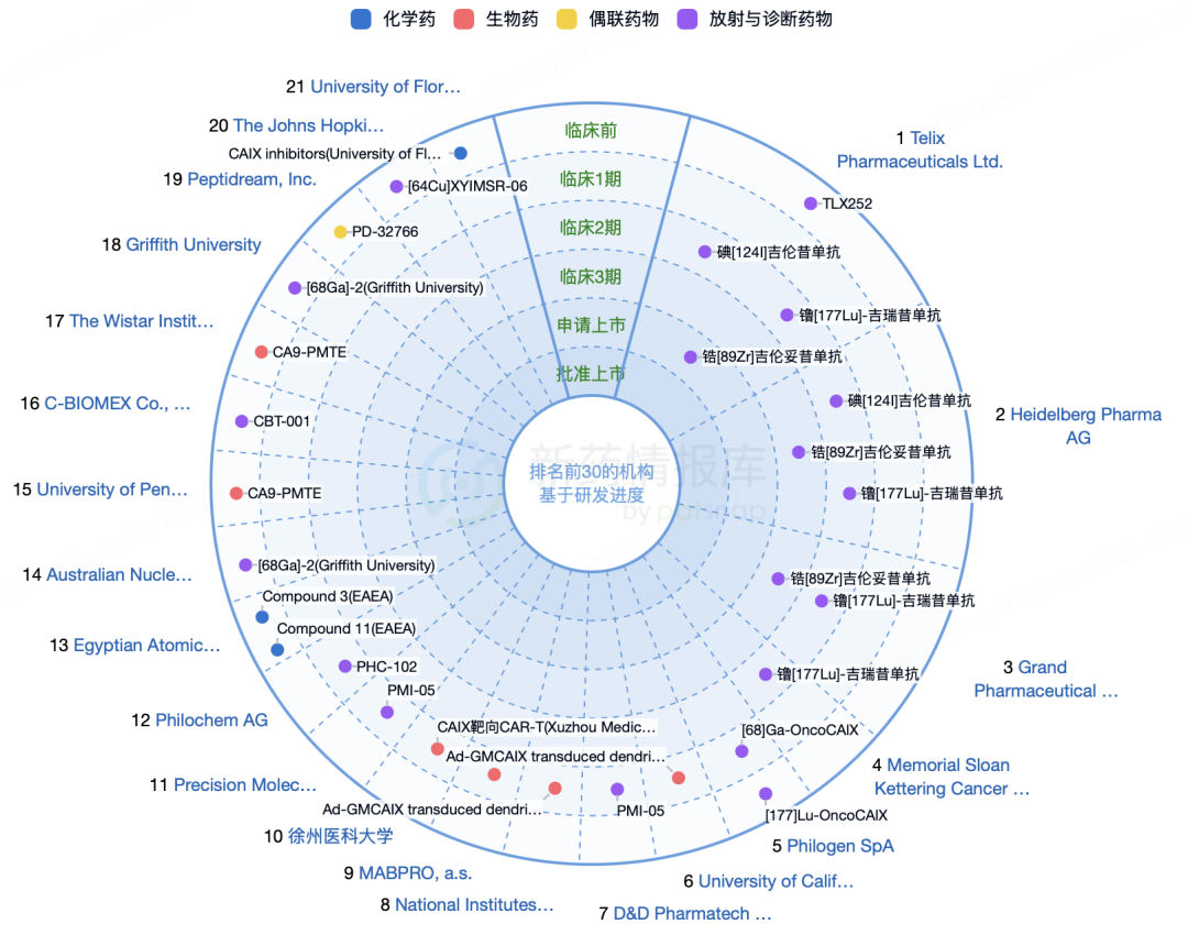 在CAIX靶點診療一體化開發領域,全球藥企已形成"診斷先行、治療突破"的戰略布局格局。隨著診斷核藥TLX250-CDx(89Zr標記)進入FDA上市審評倒計時,治療性核藥研發競賽已進入白熱化階段。一方面,Debiopharm的68Ga/177Lu-DPI-4452憑借其卓越的靶向性和臨床潛力,率先搶占了治療性環肽核藥的賽道;另一方面,PeptiDream開發的PD-32766以及國內團隊研發的[177Lu]Lu-XYIMSR-01也緊隨其后,展現出強勁的競爭力。核藥企業們正加速布局CAIX靶點治療賽道,全力開展靶向性治療核藥的開發工作,競相爭奪首款治療性核藥產品的研發先機,這將不僅是技術實力的較量,更是一場戰略布局和推進速度的比拼,期待未來的突破進展。