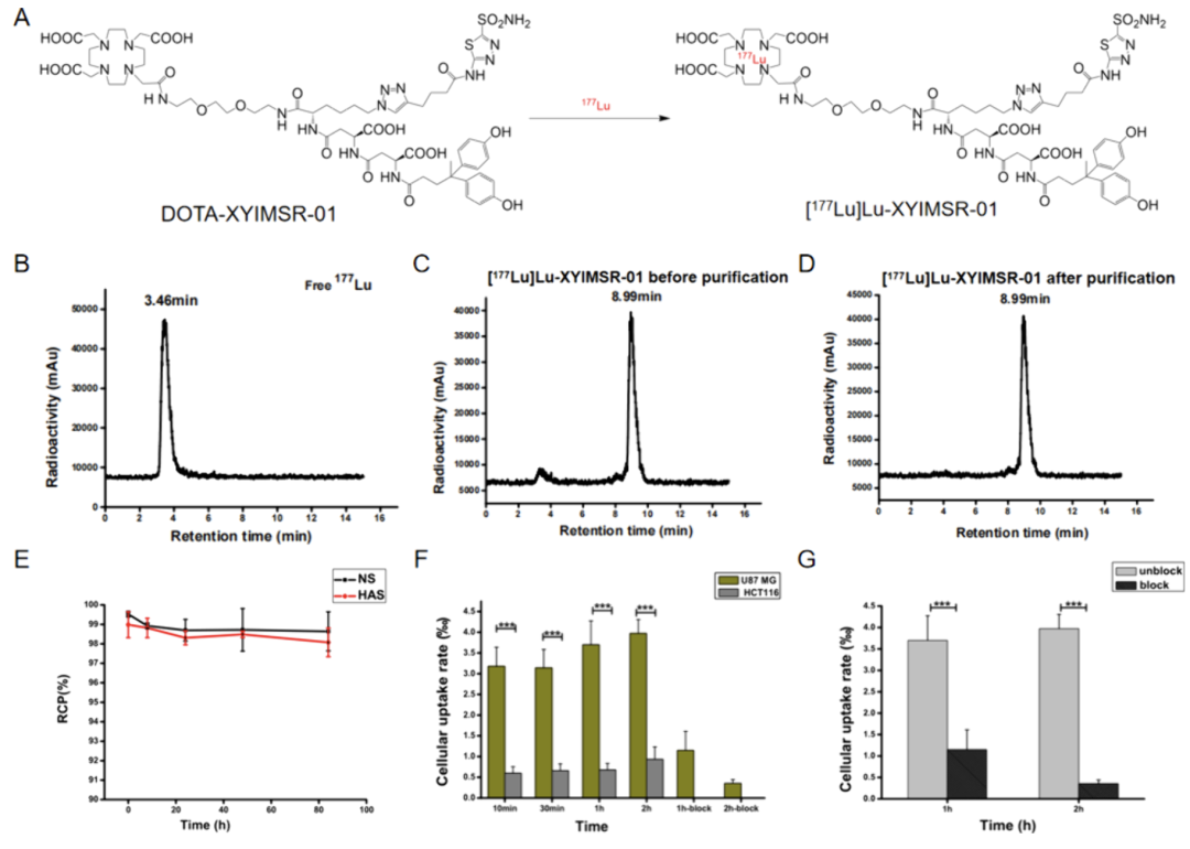在體外實驗中,[177Lu]Lu-XYIMSR-01對U87MG膠質瘤細胞的攝取率顯著高于HCT116細胞,表明其對CAIX高表達的腫瘤細胞具有高度特異性。在小鼠模型中,該藥物通過尾靜脈注射后,能夠在腫瘤部位快速富集,并通過微SPECT/CT成像清晰顯示腫瘤信號。24小時后,腫瘤部位的信號最為清晰,且藥物主要通過腎臟代謝排出體外,未在其他組織中檢測到明顯信號。