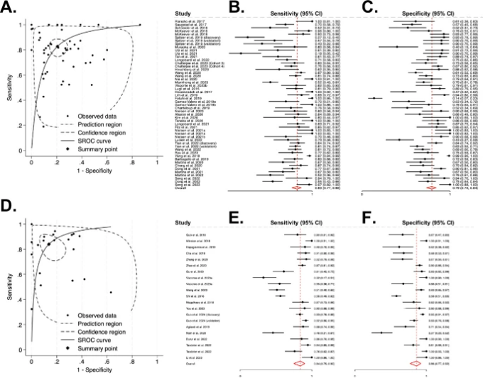 源自細胞外囊泡(EVs)的生物標志物用于區分阿爾茨海默病(AD)患者和陰性對照(NCs)的薈萃分析。A 至 C:全血細胞外囊泡(EVs)的合并診斷準確性、靈敏度和特異度。D 至 F:推測的中樞神經系統富集的細胞外囊泡(EVs)的合并診斷準確性、靈敏度和特異度。
