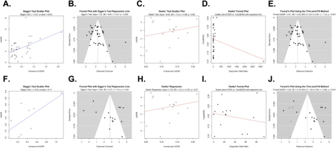 使用貝格相關性檢驗、埃格回歸分析、迪克回歸分析以及漏斗圖,對源自細胞外囊泡(EVs)的生物標志物用于區分阿爾茨海默病(AD)患者和陰性對照(NCs)的情況進行發表偏倚評估,以及應用剪補法后的漏斗圖。A 至 E:全血細胞外囊泡(EVs)的發表偏倚評估。F 至 J:推測的中樞神經系統富集的細胞外囊泡(EVs)的發表偏倚評估。