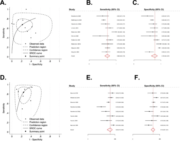 源自細胞外囊泡(EVs)的生物標志物用于區分阿爾茨海默病(AD)患者和輕度認知障礙(MCI)患者的薈萃分析。A 至 C:全血細胞外囊泡(EVs)的合并診斷準確性、靈敏度和特異度。D 至 F:推測的中樞神經系統富集的細胞外囊泡(EVs)的合并診斷準確性、靈敏度和特異度。
