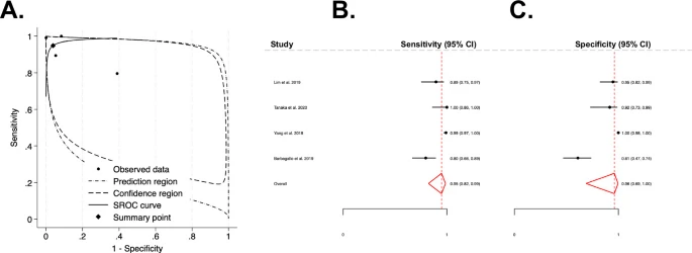 源自細胞外囊泡(EVs)的生物標志物用于區分阿爾茨海默病(AD)患者和血管性認知障礙和癡呆(VCID)患者的薈萃分析。A 至 C:全血細胞外囊泡(EVs)的合并診斷準確性、靈敏度和特異度。