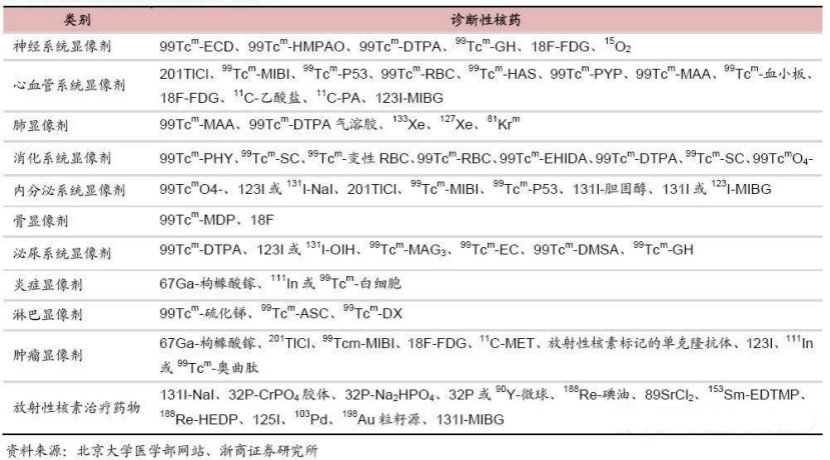 目前核藥重點發展的領域,診斷應用包括腫瘤、心腦血管、神經、骨骼等多種顯像診斷,治療應用上包括甲狀腺疾病、腫瘤治療、靶向治療等。診斷應用是指放射性核素顯像及臟器功能測定為主的體內診斷法,國內的運用已經逐漸趨于完整。而治療應用是指放射性藥物能夠高度選擇性濃集在病變組織產生局部電離輻射生物效應,從而抑制或破壞病變組織發揮治療作用的一類體內放射性藥物。