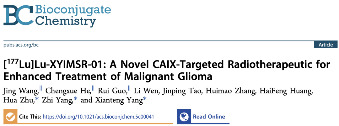 2025年2月,貴州省人民醫院楊先騰教授與北京大學腫瘤醫院核醫學科楊志主任、朱華研究員為共同通訊作者在《Bioconjugate Chemistry 》期刊上正式發表名為“[177Lu]Lu-XYIMSR-01: A Novel CAIX-Targeted Radiotherapeutic for Enhanced Treatment of Malignant Glioma”的研究論文,該研究成功開發了一種新型的靶向藥物[177Lu]Lu-XYIMSR-01,為惡性膠質瘤的治療帶來了新的曙光。