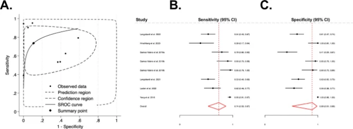 源自細胞外囊泡(EVs)的生物標志物用于區分阿爾茨海默病(AD)患者和血管性認知障礙和癡呆(VCID)患者的薈萃分析。A 至 C:全血細胞外囊泡(EVs)的合并診斷準確性、靈敏度和特異度。