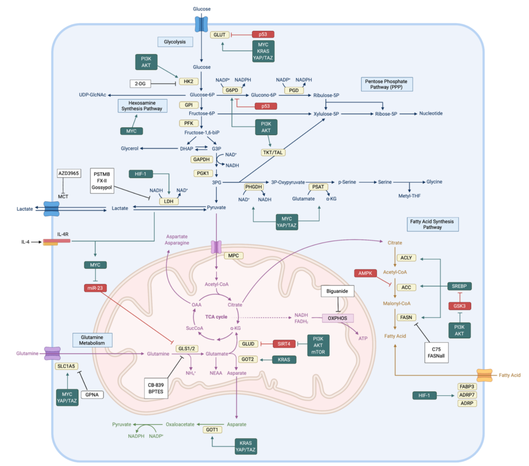 腫瘤是由致癌基因和腫瘤抑制基因的突變引起的。這些基因突變直接調控代謝酶的表達和活性。例如,c-MYC激活谷氨酰胺攝取,TP53調節癌細胞中的脂質代謝。癌細胞的異常代謝不僅僅是一種遺傳突變表型。它還直接影響腫瘤信號轉導途徑和細胞反應。基于這一概念,在許多研究和臨床試驗中研究針對特異性代謝表型的下一代抗癌藥物。